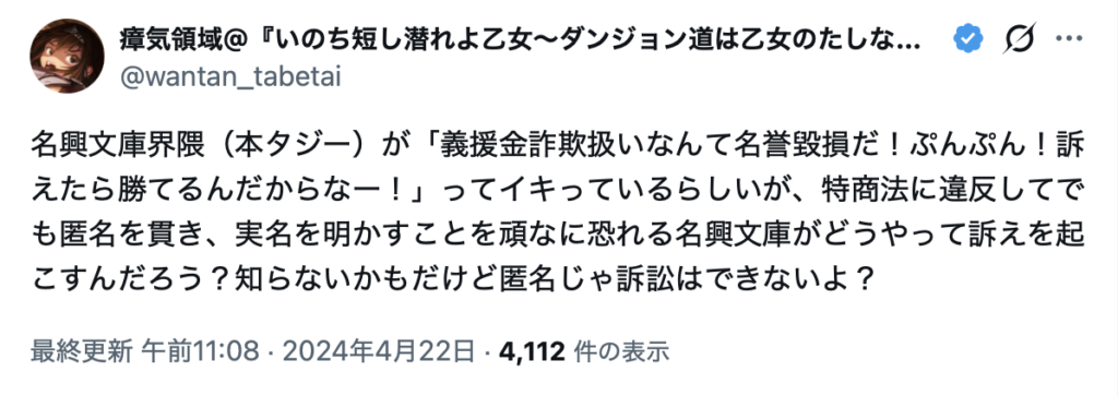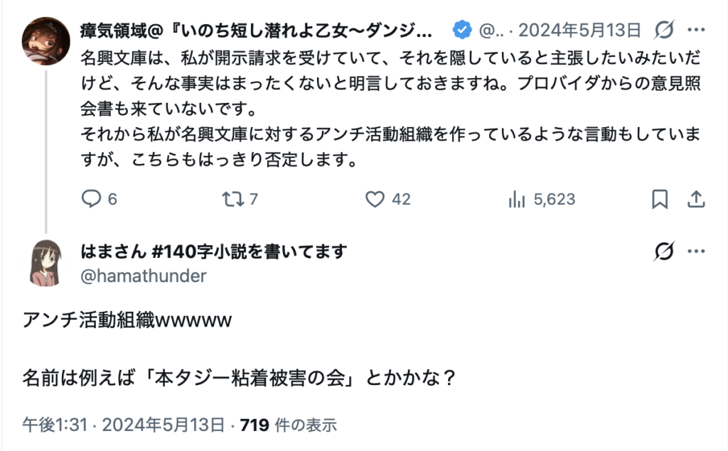 また、名興文庫は、2024年1月以降、「義援金詐欺」「詐欺師」などの表現を含む投稿による誹謗中傷を継続的に受けている。これらの投稿について、東京地方裁判所民事第9部に対して発信者情報開示命令の申立てを行い、現在までに30以上のアカウントについて開示が認められている。