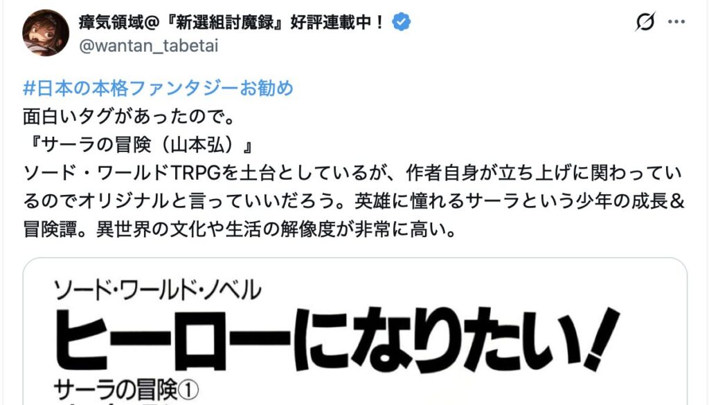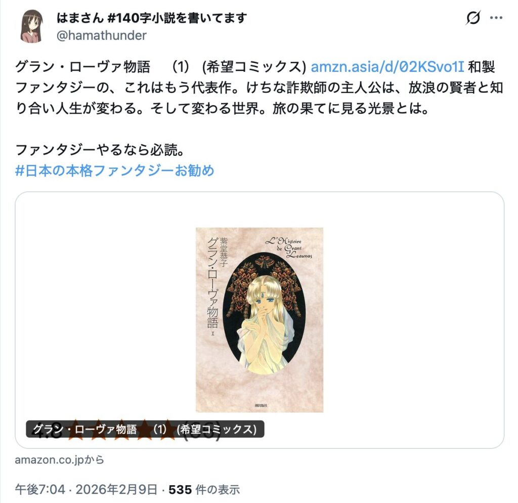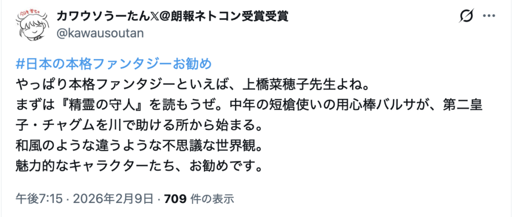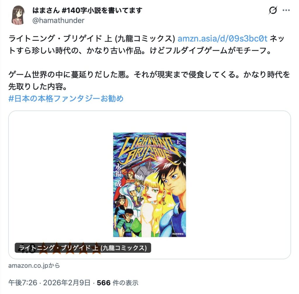 このような状況下において、2026年2月9日午後6時58分、「はまさん(@hamathunder)」が「#日本の本格ファンタジーお勧め」というハッシュタグを使用し、作品紹介の投稿を開始した。