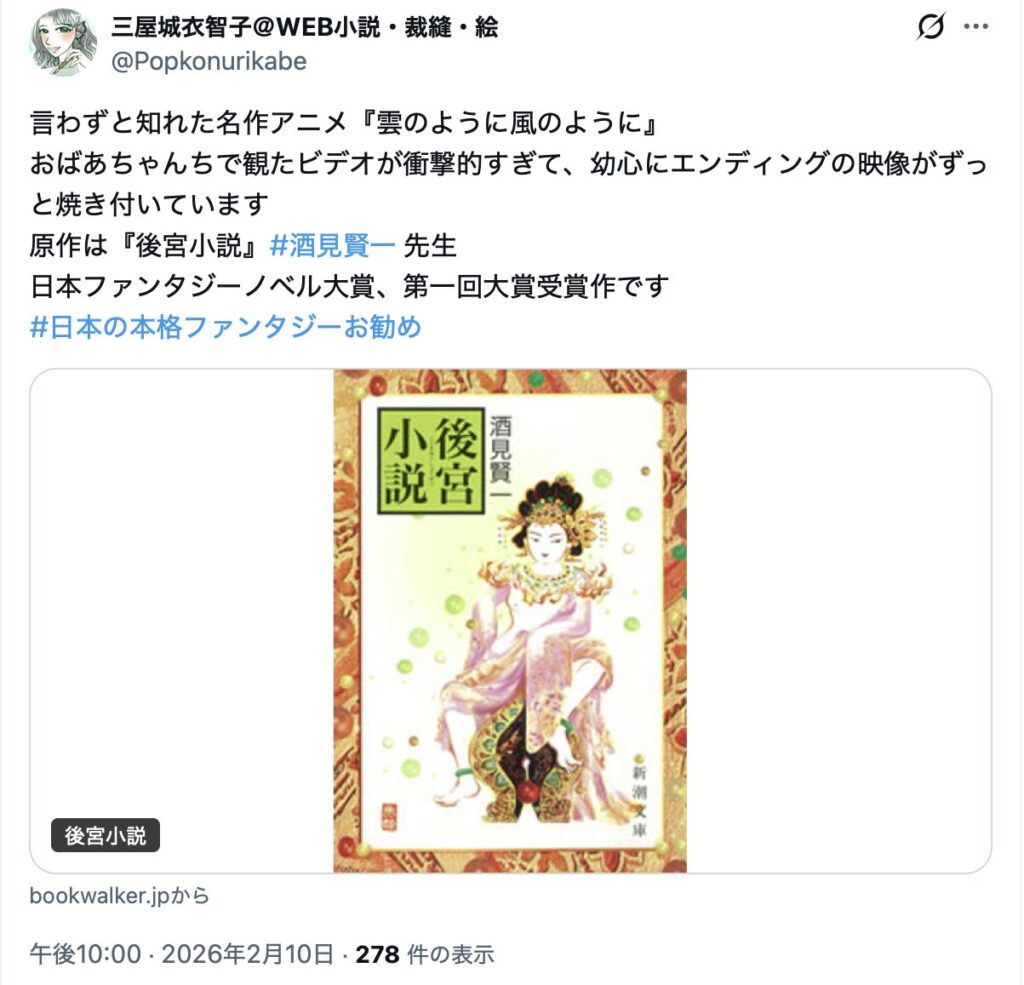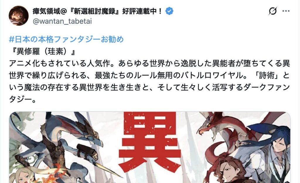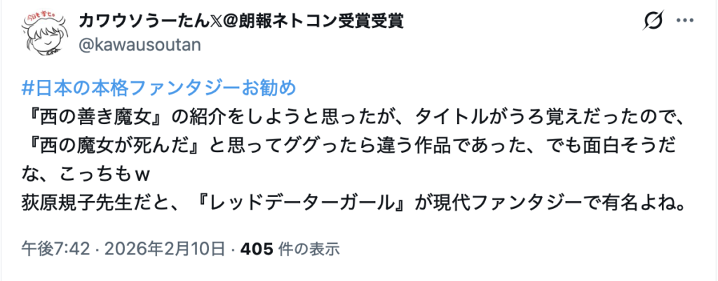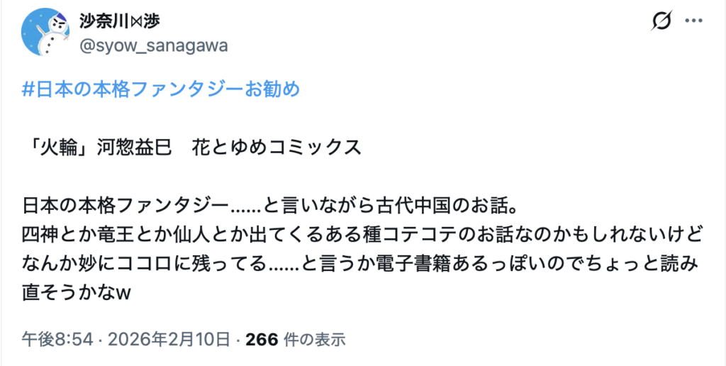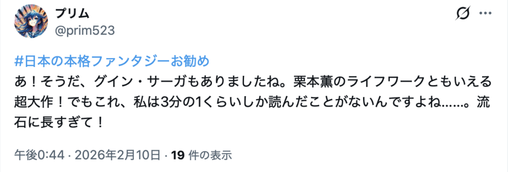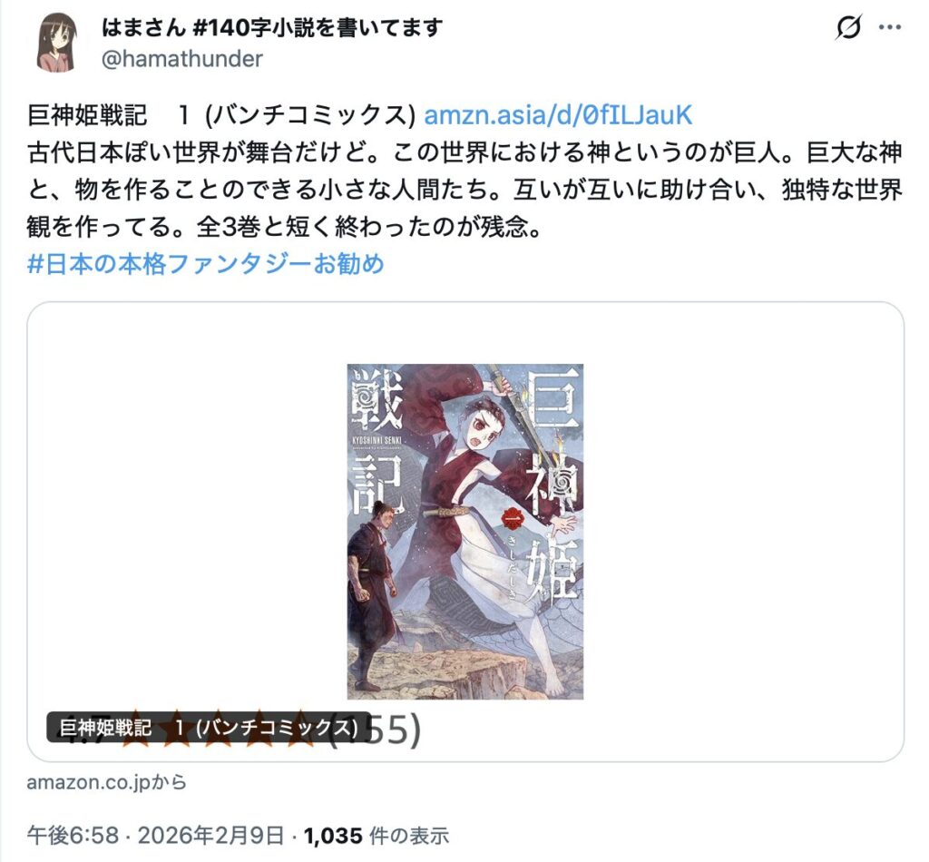 このような状況下において、2026年2月9日午後6時58分、「はまさん(@hamathunder)」が「#日本の本格ファンタジーお勧め」というハッシュタグを使用し、作品紹介の投稿を開始した。