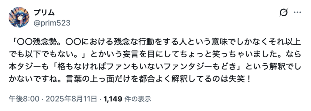 これらの事情を総合的に考慮すると、名興文庫としては、当該ハッシュタグ活動は、名興文庫が提唱する「本格ファンタジー」の概念を意図的に曖昧化させる行為であり、結果として名興文庫の事業活動に影響を与える営業妨害的活動であるとの認識を有している。