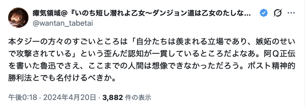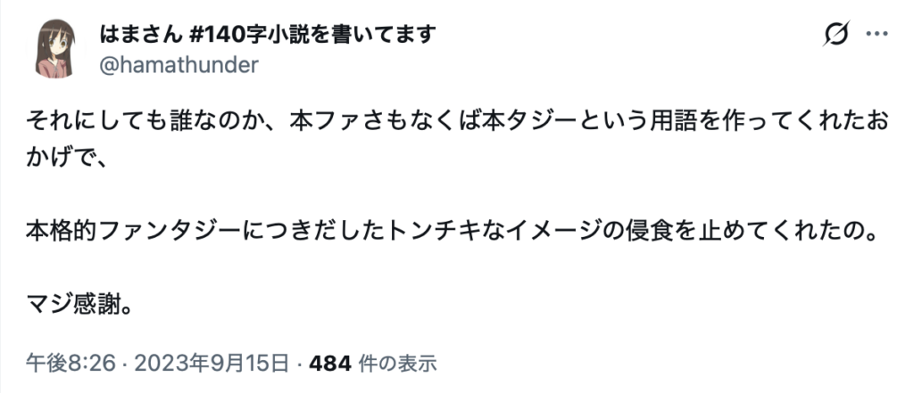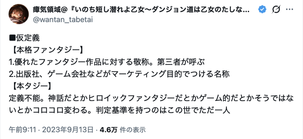 このような状況において、2023年9月13日午前9時11分、「瘴気領域(@wantan_tabetai)」が、「本格ファンタジー」とは別に「本タジー」という用語を作成した。